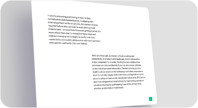 From the processing and storing of data, to data normalization and standardization, to aligning with external partners on file structures, the number of steps required before data can even be evaluated can hold projects back – or keep them from ever getting started. It’s more critical than ever to streamline these steps and embrace emerging technologies to easily scale data connectivity and enable collaboration with more partners more quickly, and easily, than ever before. With all of that said, as mission critical as scaling data connectivity is in today’s data landscape, there’s still another, major component to consider: Scaling the data collaboration processes are only worthwhile if you can also ensure ultimate protection of personal information. The data sharing process itself is only as secure as the technology and safety measures in place to not only comply with restrictions and legislations put in place to safeguard personally identifiable information (PII), but to also truly safeguard personal privacy by maintaining custody of sensitive information and keeping it out of the wrong hands, whether accidentally or maliciously. 6