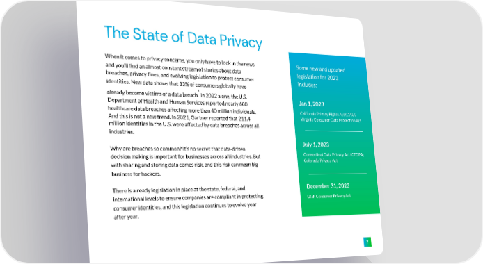 The State of Data Privacy When it comes to privacy concerns, you only have to look in the news Some new and updated and you’ll find an almost constant stream of stories about data legislation for 2023 breaches, privacy fines, and evolving legislation to protect consumer includes: identities. New data shows that 33% of consumers globally have 2 already become victims of a data breach. In 2022 alone, the U.S. Jan 1, 2023 Department of Health and Human Services reported nearly 600 California Privacy Rights Act (CPRA) healthcare data breaches affecting more than 40 million individuals. Virginia Consumer Data Protection Act And this is not a new trend. In 2021, Gartner reported that 211.4 million identities in the U.S. were affected by data breaches across all industries. July 1, 2023 Why are breaches so common? It’s no secret that data-driven Connecticut Data Privacy Act (CTDPA) decision making is important for businesses across all industries. But Colorado Privacy Act with sharing and storing data comes risk, and this risk can mean big business for hackers. December 31, 2023 There is already legislation in place at the state, federal, and international levels to ensure companies are compliant in protecting Utah Consumer Privacy Act consumer identities, and this legislation continues to evolve year after year. 7
