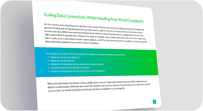Scaling Data Connectivity While Handling Real-World Complexity As the need for more data from more partners rises, so does the need for methods of data exchange that simplify the process. Finding and vetting data partners can take months, and it’s hard to trust data partners not to mishandle or misuse your data. Before you can even evaluate the benefits of connecting data sources, preparing to connect data takes a great deal of manual effort. Many of the steps are lengthy, costly, and cumbersome. Once the data is approved, there’s still concern about how to make regular updates, and if the data doesn’t pass the evaluation, you must begin the time consuming, lengthy process over from the beginning. According to IT leaders, the top complexities of data sharing and integration projects are: Alignment on security protocol Alignment on file formats Alignment of data element normalization/standardization Downtime associated with data refreshes Custom development/coding required for each integration When we look toward the future of data collaboration, we see a major push toward interoperability and a focus on digital transformation. With this also comes the need for more precise and accurate data from more (and more varied) sources, but real-world complexity has historically been a roadblock to achieving this. 5