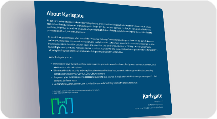 About Karlsgate At our core, we’re data scientists and technologists who, after more than two decades in the industry, have come to a major realization: the way companies are handling data simply isn’t the best way anymore. It’s slow, it’s risky, and truthfully – it's outdated. With that in mind, we created Karlsgate to provide Privacy Enhancing Data Processing and Connectivity Tools to protect data at rest, in transit, and in use. As we at Karlsgate embrace what we call the “Protected Data Age,” we’re changing the game. Gone are the days of slow data exchanges, vulnerable consumer information, and costly breaches. Data is more powerful than ever and harnessing it to drive business decisions should be quicker, easier, and safer than ever before, too. Founded in 2020 by a team of veteran data technologists and scientists, Karlsgate takes a zero-trust approach to data connectivity with Karlsgate Identity Exchange (KIE™), allowing the free flow of insights while maintaining control of sensitive information. With Karlsgate, you can: Immediately save the cost and time to interoperate your data securely and compliantly across partners, customers, cloud solutions and internal systems. Eliminate the data security and compliance burden to effectively host, connect, and manage sensitive data, ensuring compliance with HIPAA, GDPR, CCPA, CPRA and more. Empower your business users to access and integrate data sources through a no-code, UI-driven system designed for their complex business needs. Automatically clean, correct, and standardize your data for integration with other data sources. 1. According to data from a 2022 third-party survey conducted on behalf of Karlsgate. 2 . 2022 Thales Consumer Digital Trust Index karlsgate.com [email protected] Follow us on LinkedIn & Twitter @Karlsgate