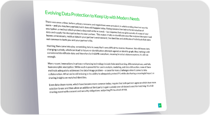Evolving Data Protection to Keep Up with Modern Needs There was once a time, before privacy concerns and regulations were prevalent, in which sending clear text was the norm – and you may be surprised, but it does still happen today. Rising concern then led to the introduction of encryption, a method which protects data well while in transit – but requires that you give custody of a copy of your data and supply the decryption key to your partner. This makes it fully re-identifiable once the recipient decrypts it and leaves unnecessary, residual data in your partner’s environment; the identities and attributes of individuals that were not common to both you and your partner’s file. Hashing then came into play, scrambling data in a way that’s very difficult to reverse. However, this still leaves data changing custody, which can lead to future re-identification attempts against an identity graph. Also, hashing is still considered identifiable data and therefore isn’t GDPR-compliant, meaning in today’s data ecosystem, it’s still not enough. More recent innovations in privacy-enhancing technology include federated learning, differential privacy, and fully homomorphic encryption. While each is powerful for use in analysis, modeling, and data obfuscation, none of these methods adequately addresses the data linkage problem – a cause for many challenges when it comes to data collaboration. What we’re still missing is the ability to adequately protect PII, while also having a meaningful impact on sharing insights on matched identities. Even data clean rooms, which have become more common today, require that both partners agree on which clean room solution to use and then allow an additional third party to gain custody over all datasets used for matching. It’s a full- sharing event with consent and security obligations, subjecting PII to a level of risk. 10
