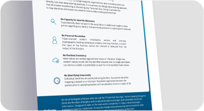Implementing privacy-by-design data sharing Karlsgate Identity Exchange solves the biggest issues with sharing insights about people. It eliminates the need to use unprotected personal identifiers to conduct commerce. This reduces many of the risks that negatively affect personal privacy rights protection without inhibiting the use cases for data sharing. Utilizing Karlsgate Identity Exchange supports organizations’ plan to build protections directly into their data-sharing practices. It is a privacy-by-design data-sharing approach that eliminates transferring or disclosing any Personal Data. Using Cryptoidentity to map identities eliminates the need for trust in data-sharing partnerships. No Capacity for Identity Discovery Cryptoidentity does not permit the acquisition of additional insight or data points regarding any identity not previously present in a participant’s data set. No Personal Revelation Triple-sourced random initialization vectors and one-way cryptographic hashing techniques create a one-way function, in which the input of the function cannot be inferred or deduced from the output of the function. No Residual Constancy Hash values are seeded against later reuse or inference. Single-use, random values mixed into the identifier ensures that no single participant can derive a stable or predictable output from the resultant hash values. No Identifying Granularity Individual identities are protected using limiters. Successful identifier mapping is based on a minimum threshold negotiated between the parties prior to uploading hashes with an absolute minimum value of 30. As we at Karlsgate embrace what we call the "Protected Data Age," we're changing the game. Gone are the days of lengthy and complicated data exchanges and vulnerable consumer information. Designed to take on the real-world complexity of today's data landscape, Karlsgate's easy-to-implement, Privacy-by-Design data processing and connectivity tools accelerate and simplify data collaboration while ensuring security and privacy. Learn more about us at karlsgate.com or get in touch at [email protected]. 1 IBM Security: Cost of a Data Breach Report, 2020. 2 Data Privacy study: 500 companies share their insights, 2020, Data Privacy Manager. 3 GDPR enforcement tracker. Copyright © 2020 Karlsgate Inc. All rights reserved. 8