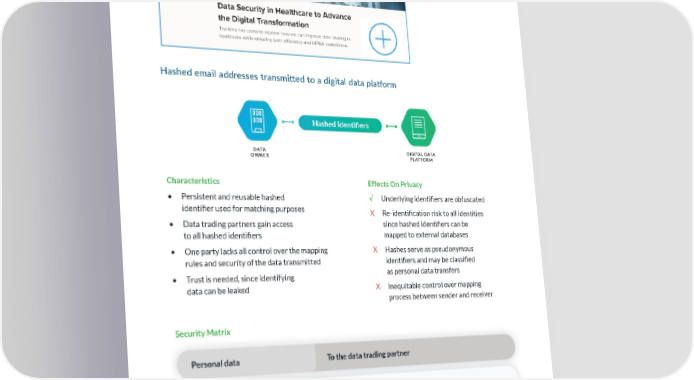 Hashed email addresses transmi琀琀ed to a digital data pla琀昀orm Hashed Identi昀椀ers DATA DIGITAL DATA OWNER PLATFORM Characteristics Effects On Privacy • Persistent and reusable hashed √ Underlying identi昀椀ers are obfuscated identi昀椀er used for matching purposes X Re-identi昀椀cation risk to all identities • Data trading partners gain access since hashed identi昀椀ers can be to all hashed identi昀椀ers mapped to external databases • One party lacks all control over the mapping X Hashes serve as pseudonymous rules and security of the data transmitted identi昀椀ers and may be classi昀椀ed • Trust is needed, since identifying as personal data transfers data can be leaked X Inequitable control over mapping process between sender and receiver Security Matrix Personal data To the data trading partner Are unknown identities exposed? Yes. The entire audience is transmitted. Can identities be re-identi昀椀ed? Yes. Stable hash values can be accumulated for later matching. Copyright © 2020 Karlsgate Inc. All rights reserved. 5