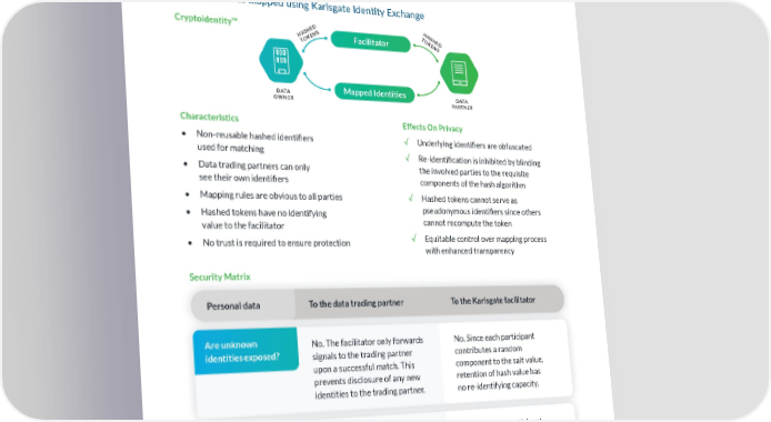 The future of sharing consumer data: Zero-trust Cryptoidentity is the secure data matching foundation of the Karlsgate Identity Exchange. Karlsgate Identity Exchange enables data owners to trade their data assets without exposing personal data in a zero-trust environment. Email addresses mapped using Karlsgate Iden琀椀ty Exchange Cryptoidentity™ HASHED T HASHED Facilitator OKENS OKENS T DATA Mapped Identities DATA OWNER PARTNER Characteristics Effects On Privacy • Non-reusable hashed identi昀椀ers √ Underlying identi昀椀ers are obfuscated used for matching √ Re-identi昀椀cation is inhibited by blinding • Data trading partners can only the involved parties to the requisite see their own identi昀椀ers components of the hash algorithm • Mapping rules are obvious to all parties √ Hashed tokens cannot serve as • Hashed tokens have no identifying pseudonymous identi昀椀ers since others value to the facilitator cannot recompute the token • No trust is required to ensure protection √ Equitable control over mapping process with enhanced transparency Security Matrix Personal data To the data trading partner To the Karlsgate facilitator To the data trading partner? Are unknown No. The facilitator only forwards No. Since each participant identities exposed? signals to the trading partner contributes a random upon a successful match. This component to the salt value, prevents disclosure of any new retention of hash value has identities to the trading partner. no re- identifying capacity. Can identities be No. The facilitator only forwards No. Since each participant re-identi昀椀ed? signals to the trading partner contributes a random upon a successful match. This component to the salt value, prevents disclosure of any new retention of hash value has identities to the trading partner. no re -identifying capacity. Copyright © 2020 Karlsgate Inc. All rights reserved. 7